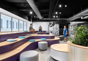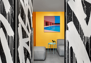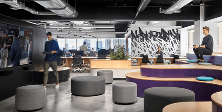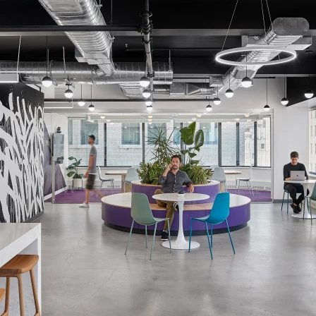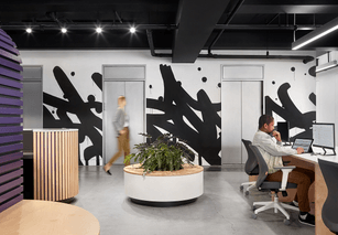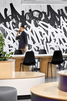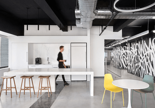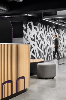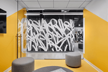 The interior design of the office embraces a monochromatic palette, heavily influenced by street art and bold graphic elements, creating a unique visual identity. The materials selected reflect a balance between industrial and modern aesthetics, featuring polished concrete, exposed ceilings and an art installation by Bisco Smith.