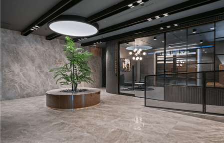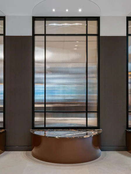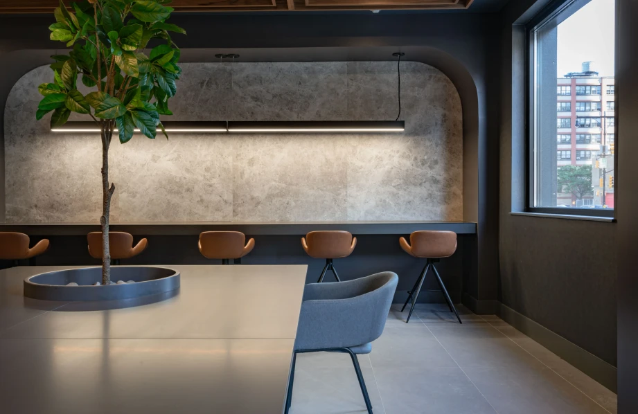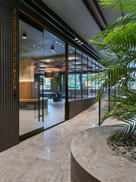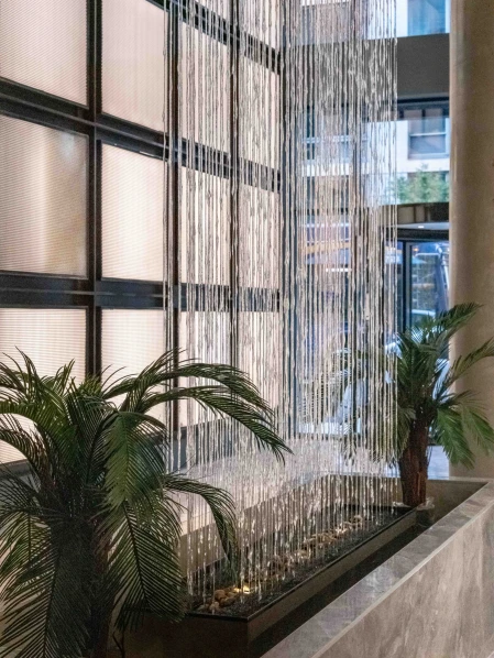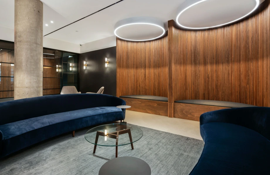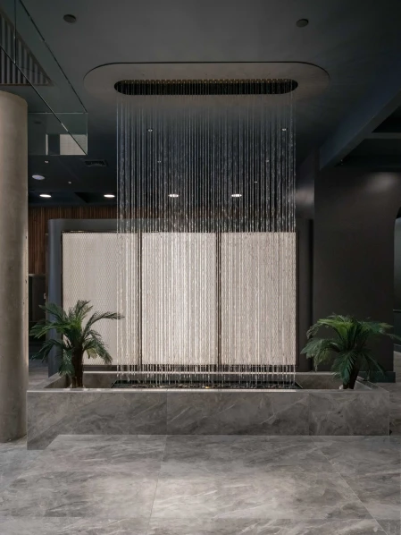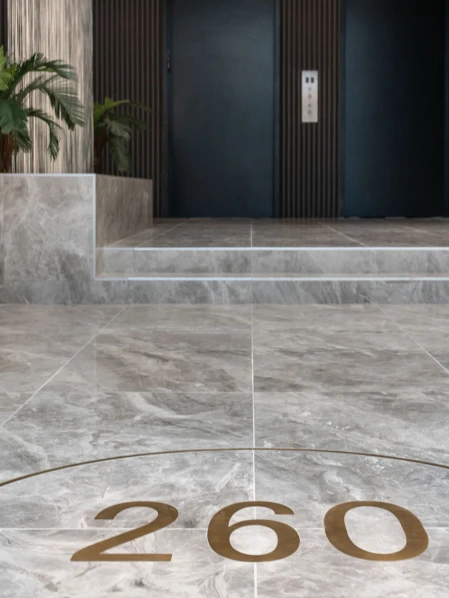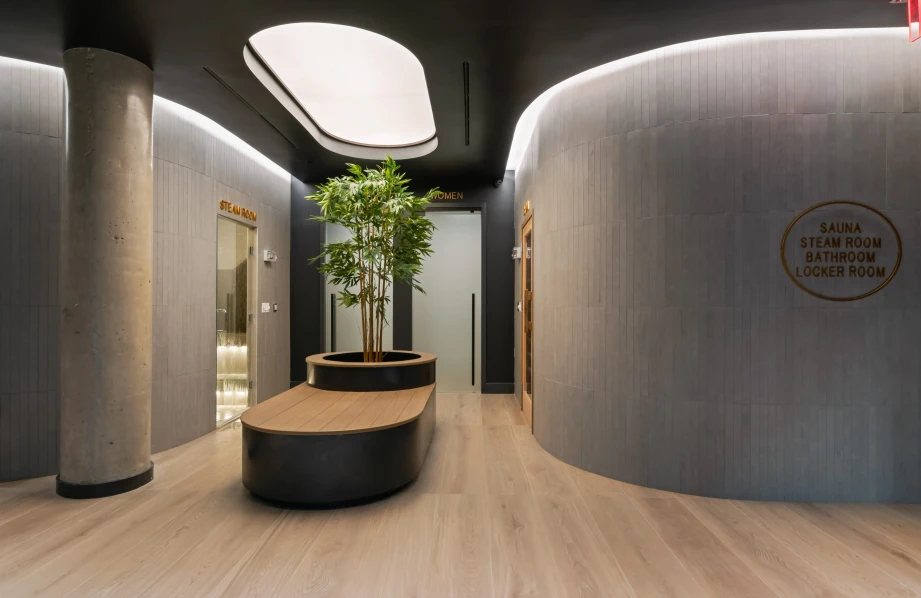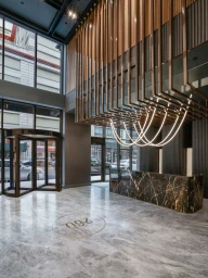 The lobby at 260 Gold Street exudes a luxurious yet welcoming ambiance, combining sleek materials with warm lighting. A cascading water feature provides a soothing focal point, complemented by sophisticated light fixtures that enhance the space’s elegance. The minimalist design and polished surfaces create a harmonious balance between tranquility and modernity.
