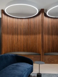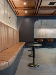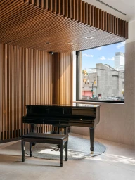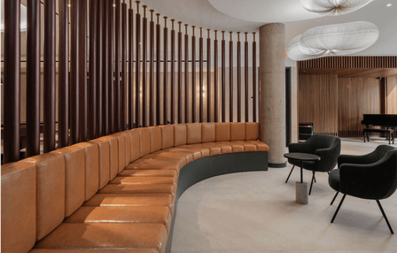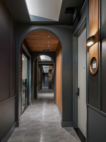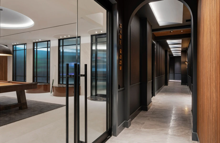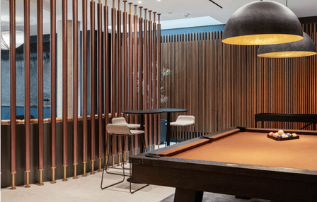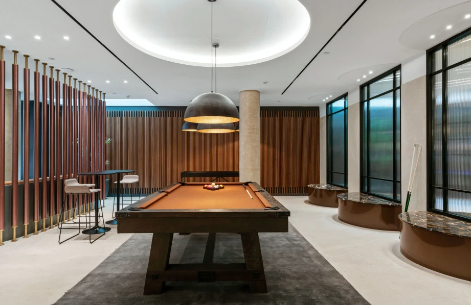 The common areas, such as the piano lounge and pool table room, are thoughtfully designed with wood dividers that add texture and warmth. These spaces are defined by dynamic shapes, rich textures, and bold colors that blend together to create a vibrant yet cohesive environment.