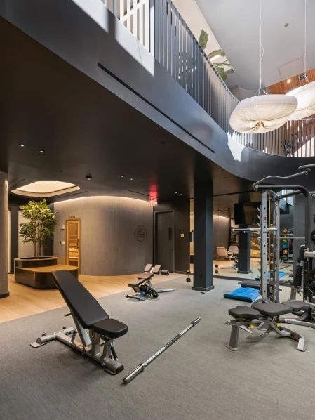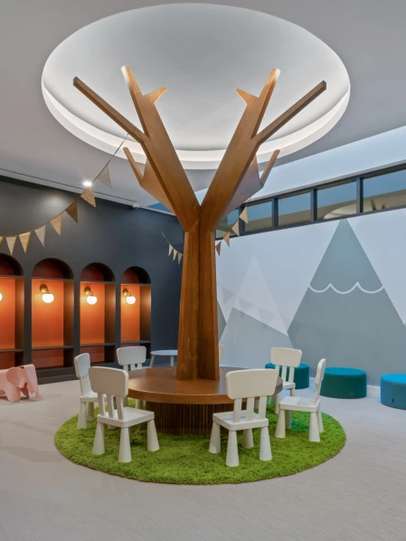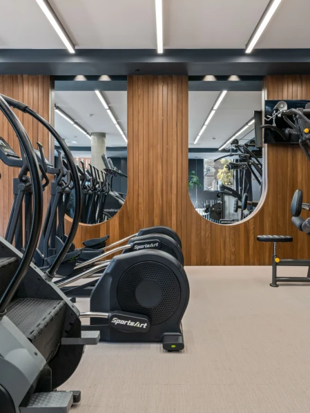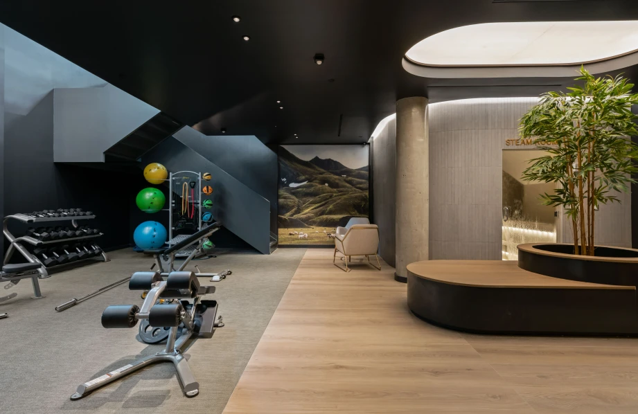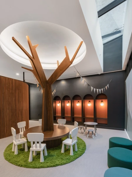 The furniture in the coworking area combines functionality with a sleek design, offering residents a productive and stylish space. The gym features modern equipment and vibrant finishes, while the kids’ room incorporates playful shapes and colors, creating a fun and engaging atmosphere for families.