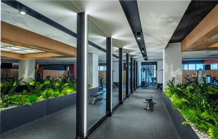 The amenities, including the indoor pool and gym, are designed with natural greenery and a mix of textures. These spaces use a variety of shapes and colors to create a relaxing yet lively environment, offering residents a balance of activity and tranquility.