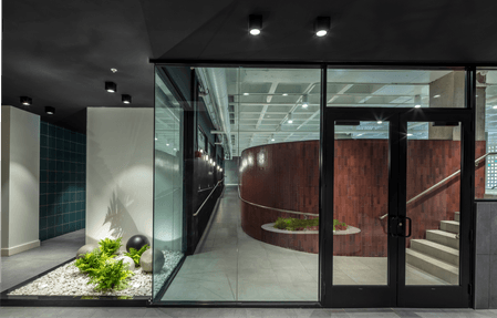 The transformation of the former NYNEX building retained key structural elements; columns and the existing waffle slab, while incorporating sleek, modern lines into the design. These original features are now elegantly integrated, creating a harmonious blend of old and new throughout the space.