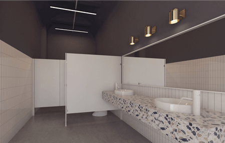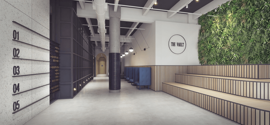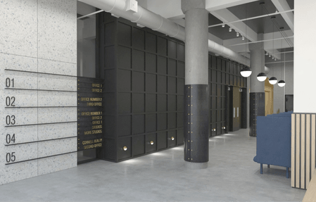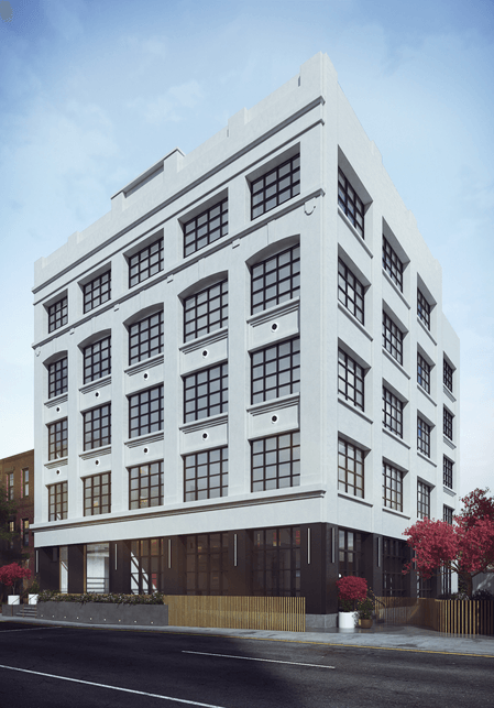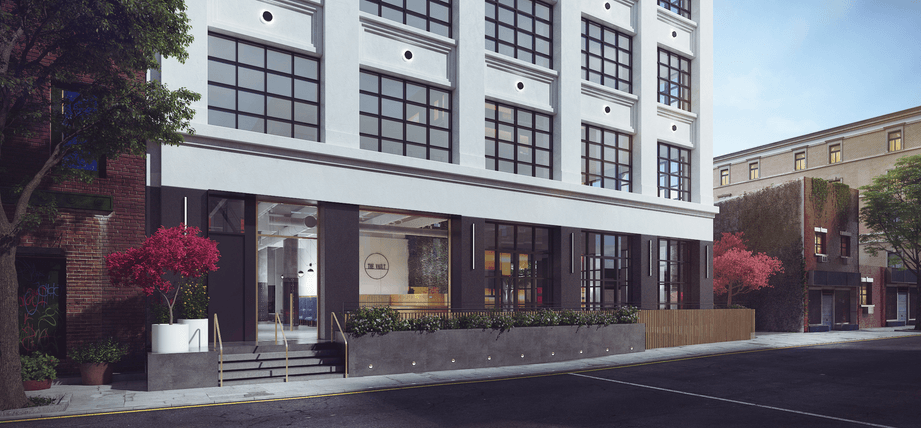 This adaptive reuse project close to the Williamsburg waterfront transforms a five floor warehouse into a spacious loft office building. The exterior of the building was updated to retain many original details that pay homage to the buildings history, while creating an open facade at the street level to activate the base of the building. The alley next to the building was also transformed from a gated parking lot into a welcoming garden courtyard. The same attention to retaining aspects of the buildings history was carried into the lobby, including incorporating a bank safe that was discovered in the building and making it an integral part of the lobby.