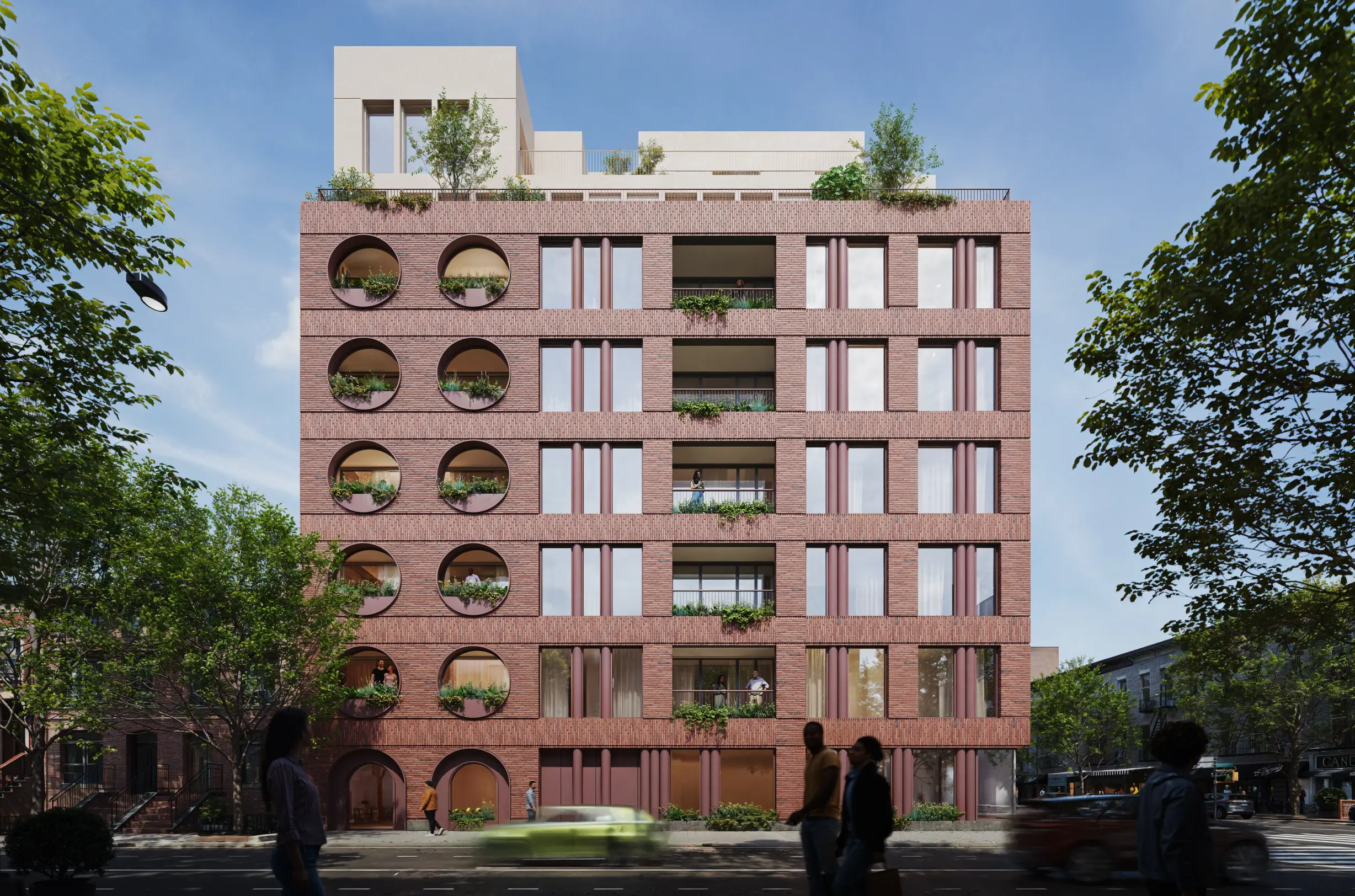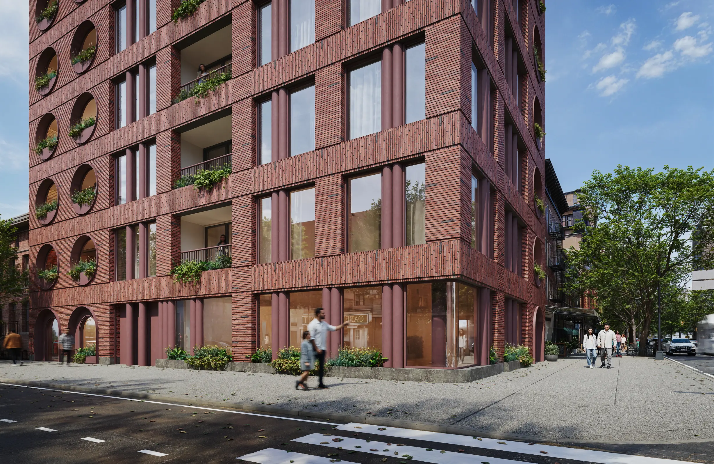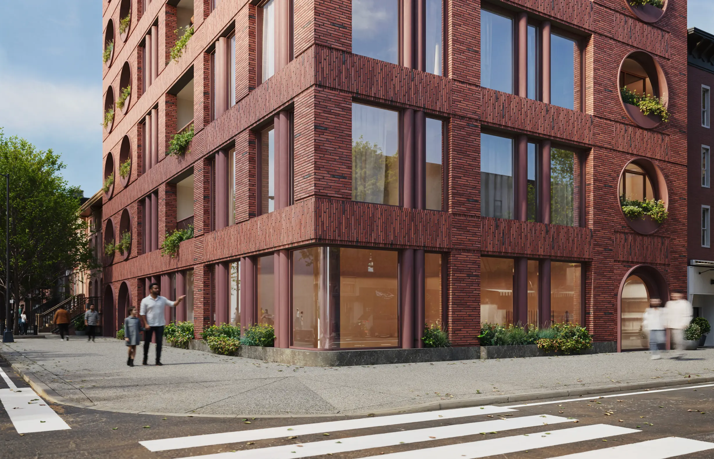 Situated on a prominent corner in a rapidly evolving Brooklyn neighborhood, this mixed-use building explores the intersection of solidity and porosity through a carefully articulated brick facade. Rounded openings punctuate the exterior, creating a rhythmic language that softens the building’s presence while acting as screens for recessed private terraces.