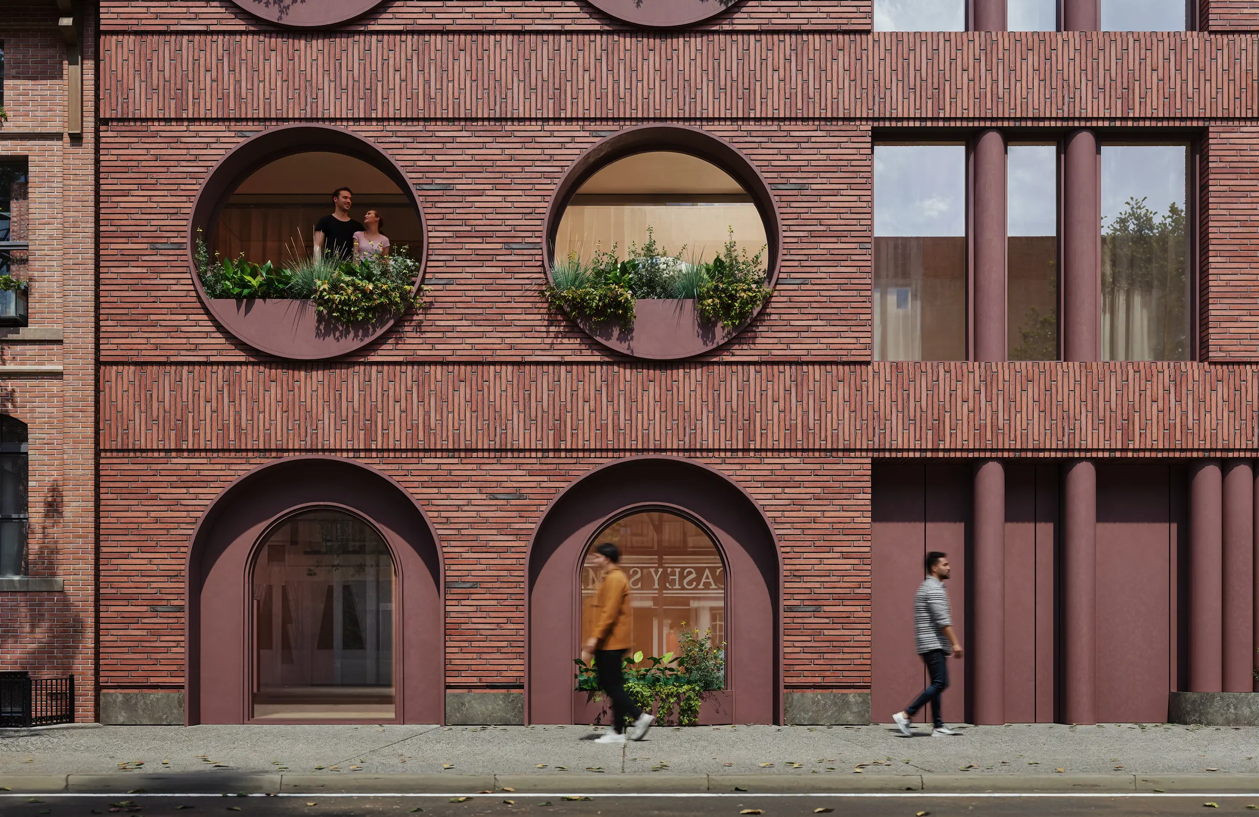 These circular voids not only provide moments of privacy but also frame opportunities for layered greenery, weaving nature into the architectural expression. The composition balances playfulness with rigor, using the curvature of the openings and the disciplined brickwork to create a facade that is both dynamic and cohesive within its urban context.