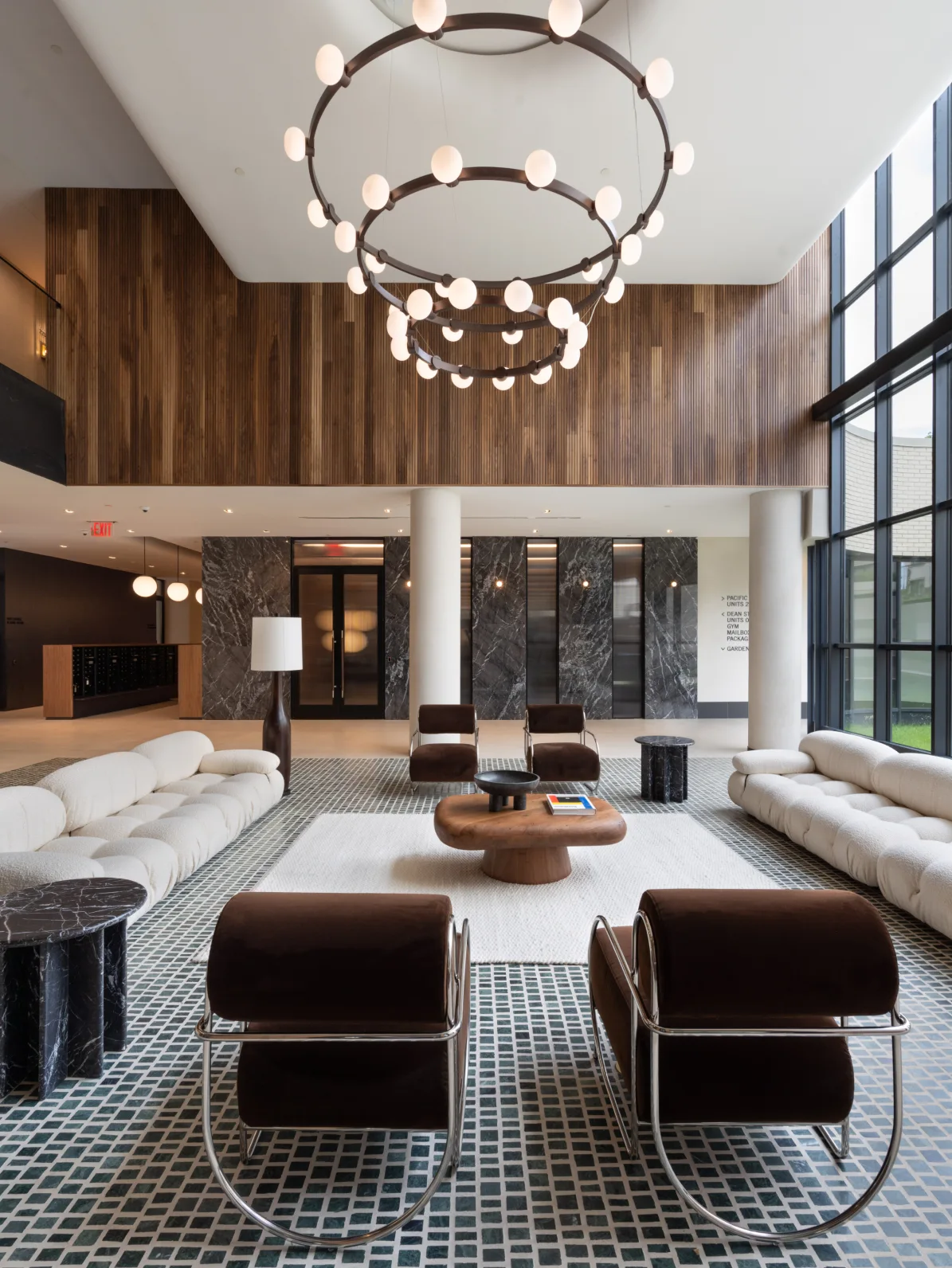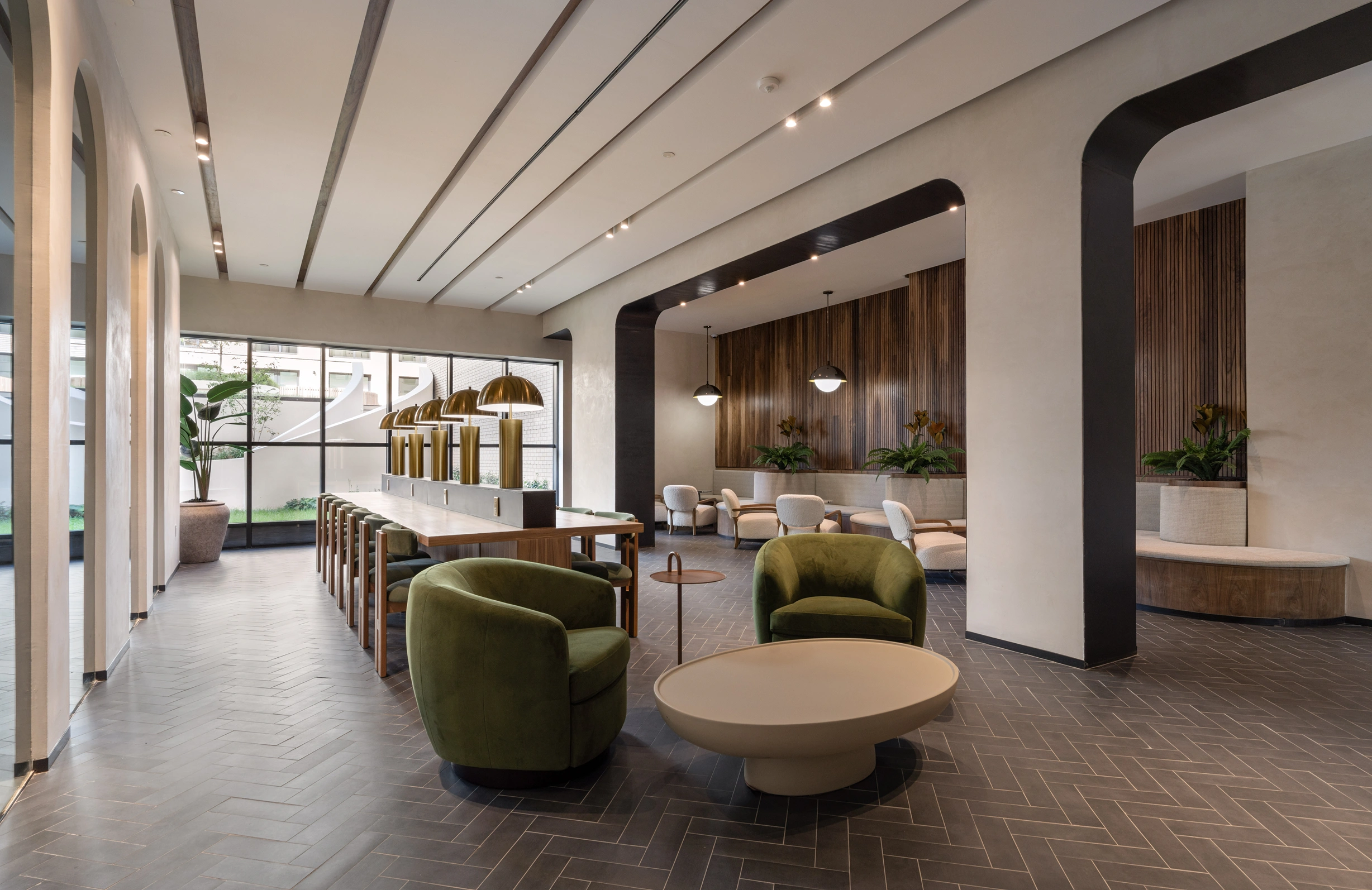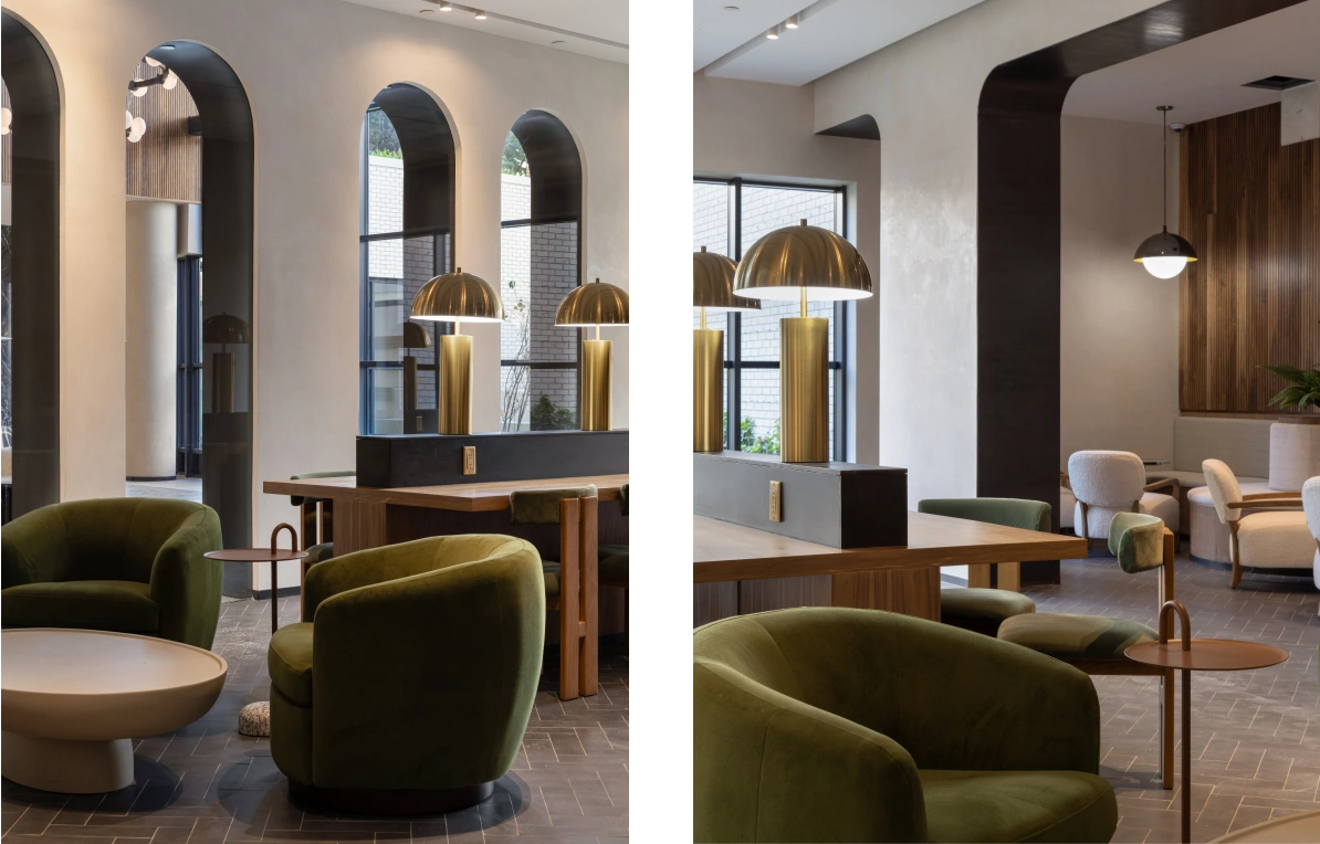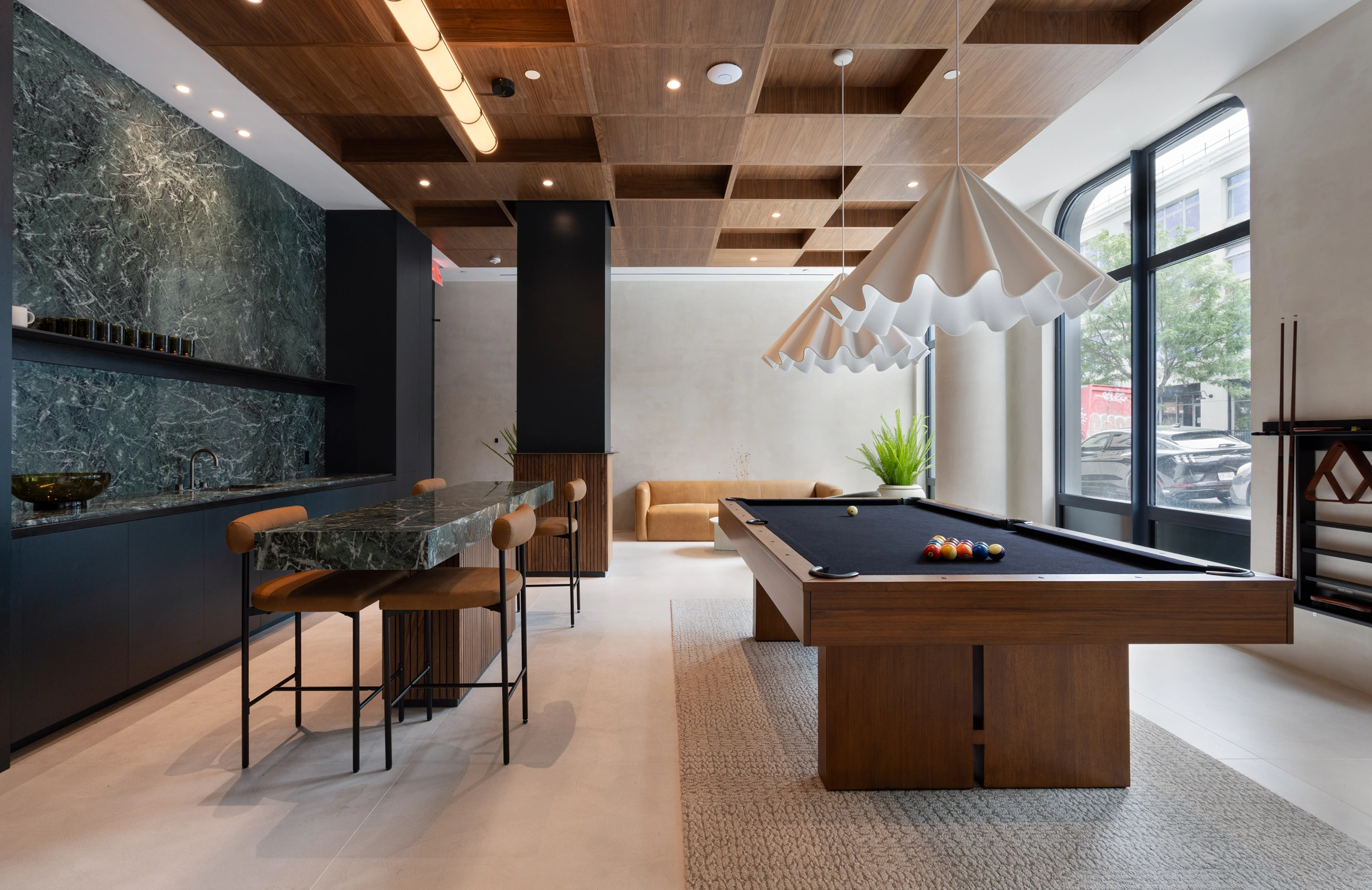 Amenity spaces throughout the building reflect a dynamic blend of utility and style, from the cozy lounge with its custom furnishings to the bold coworking zone framed by natural light and wooden accents.