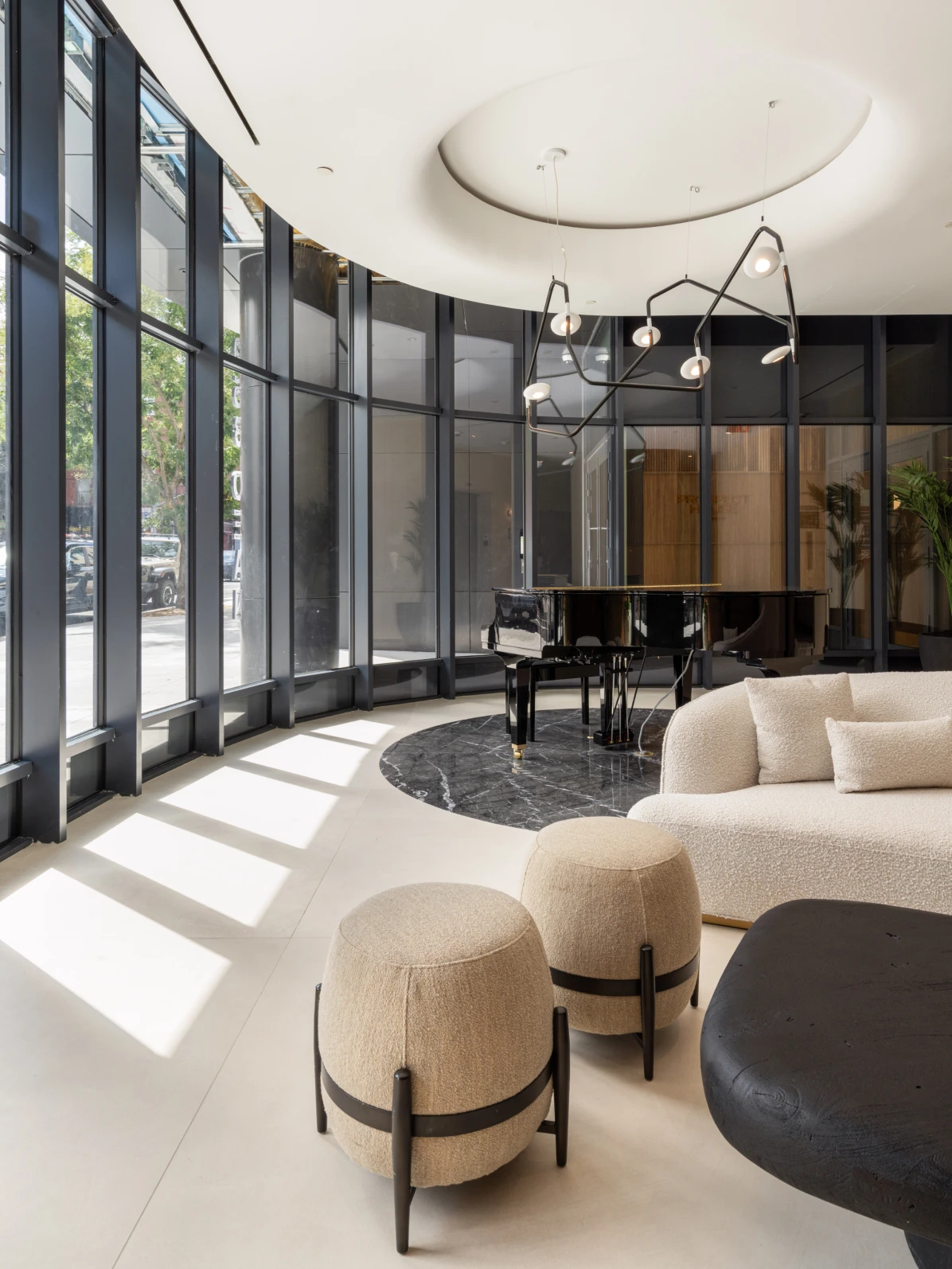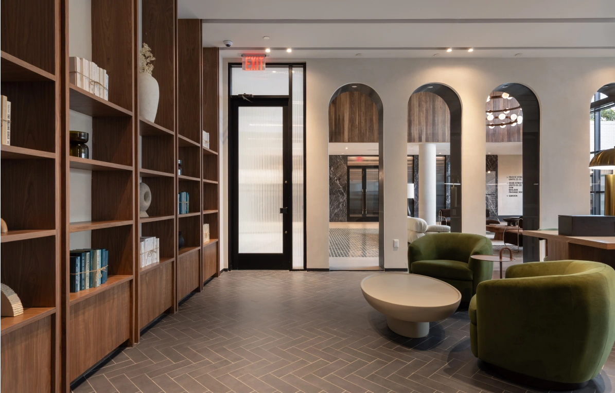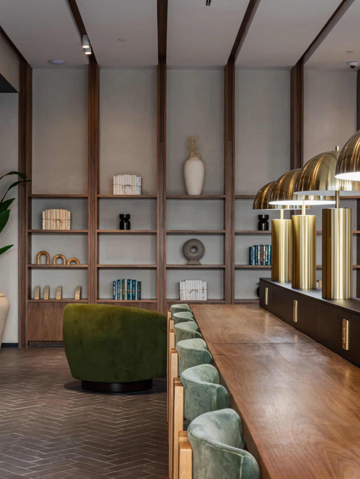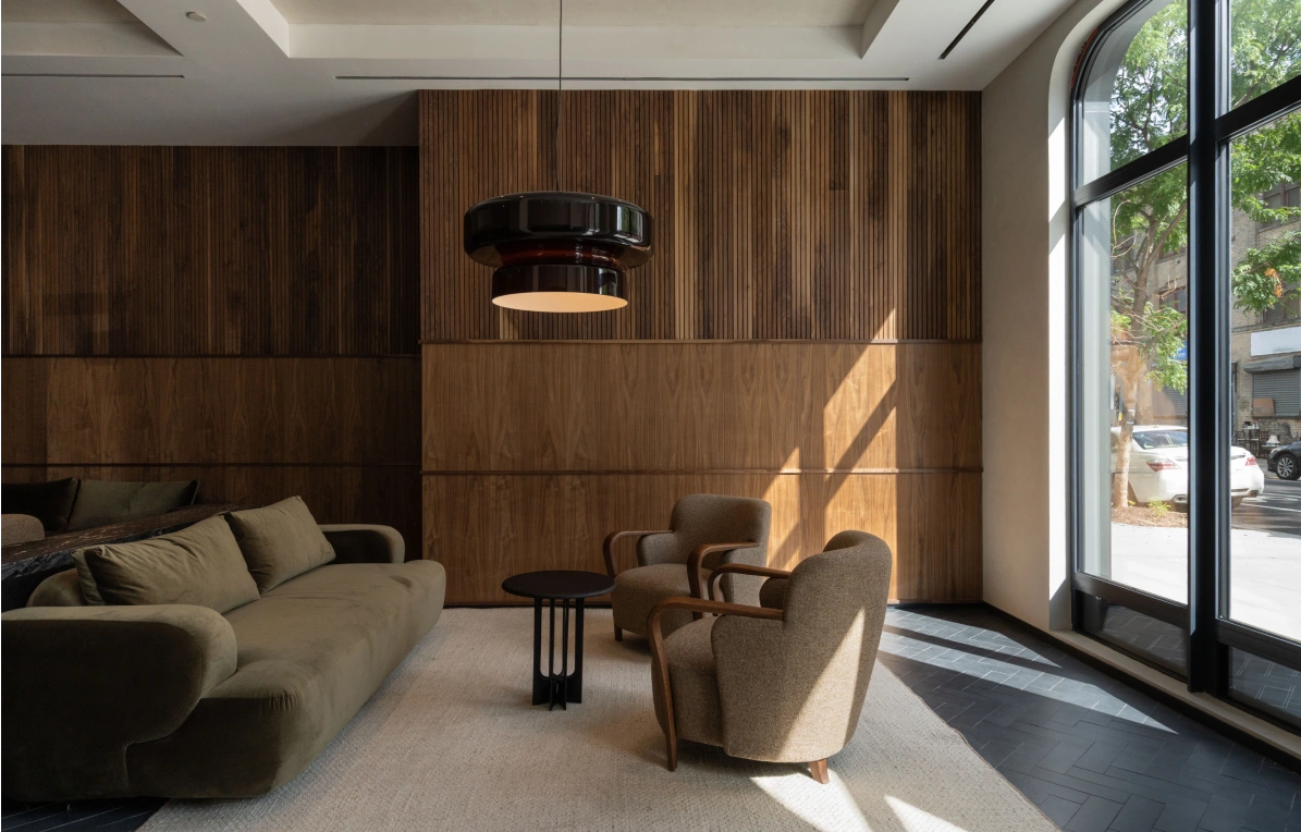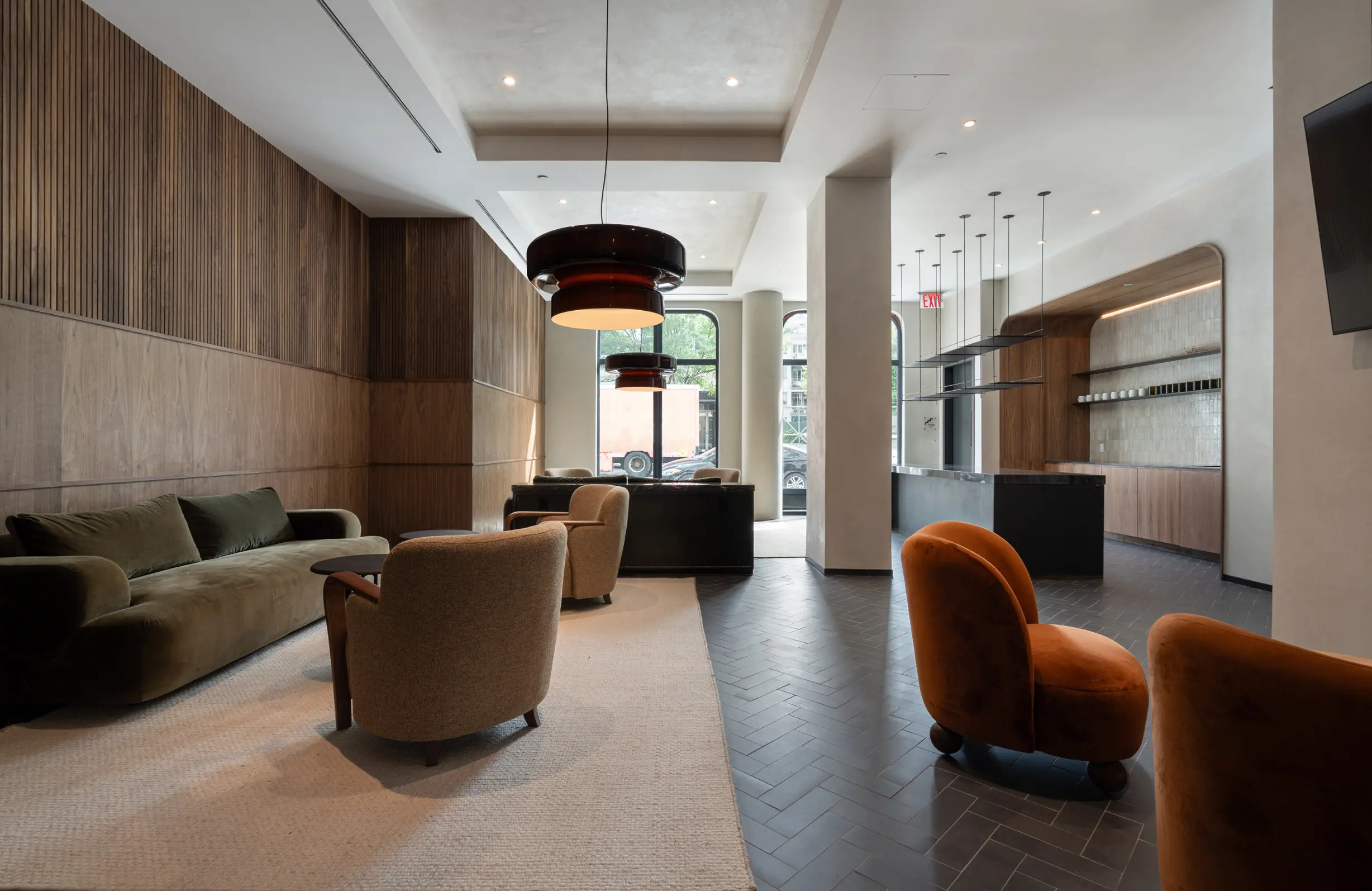 Amenity spaces throughout the building reflect a dynamic blend of utility and style, from the cozy lounge with its custom furnishings to the bold coworking zone framed by natural light and wooden accents.