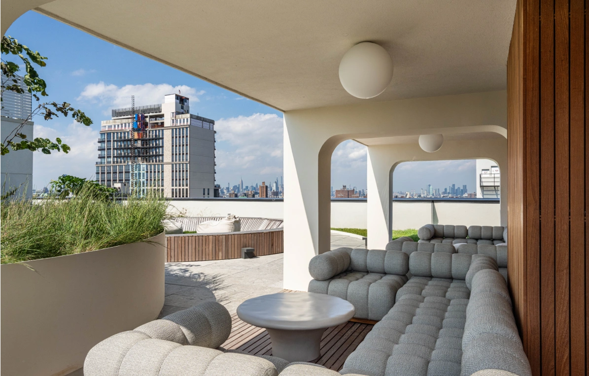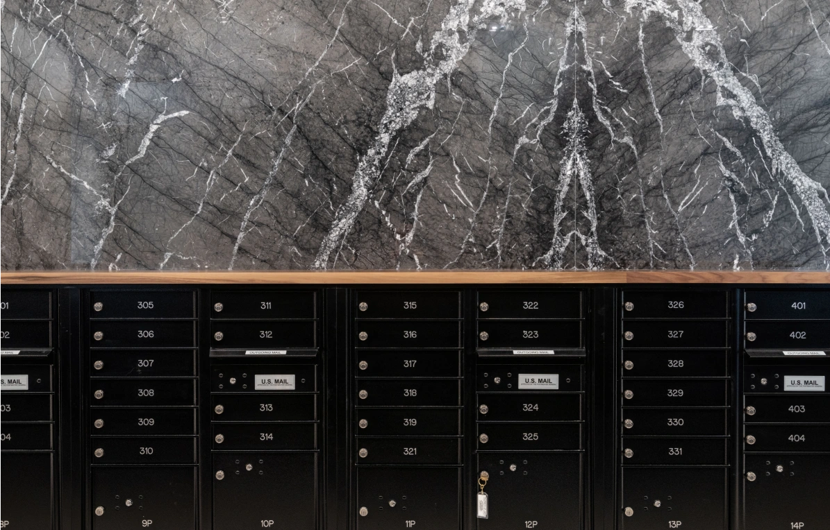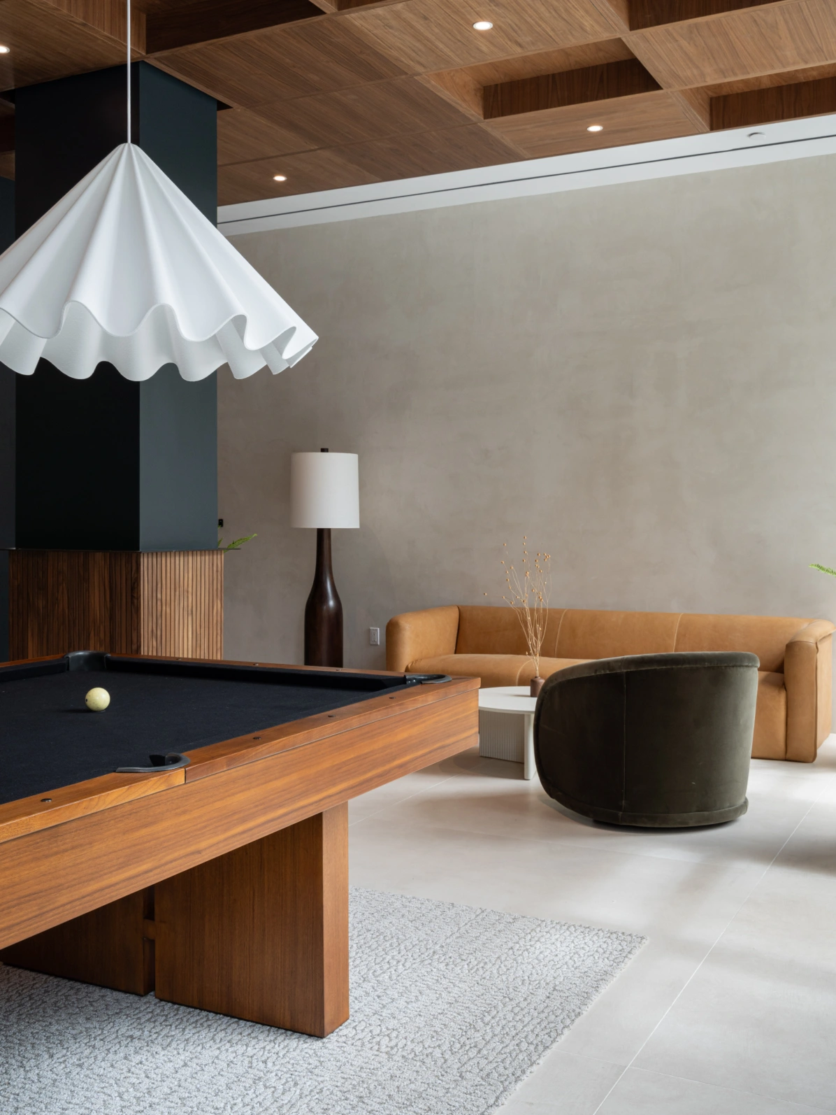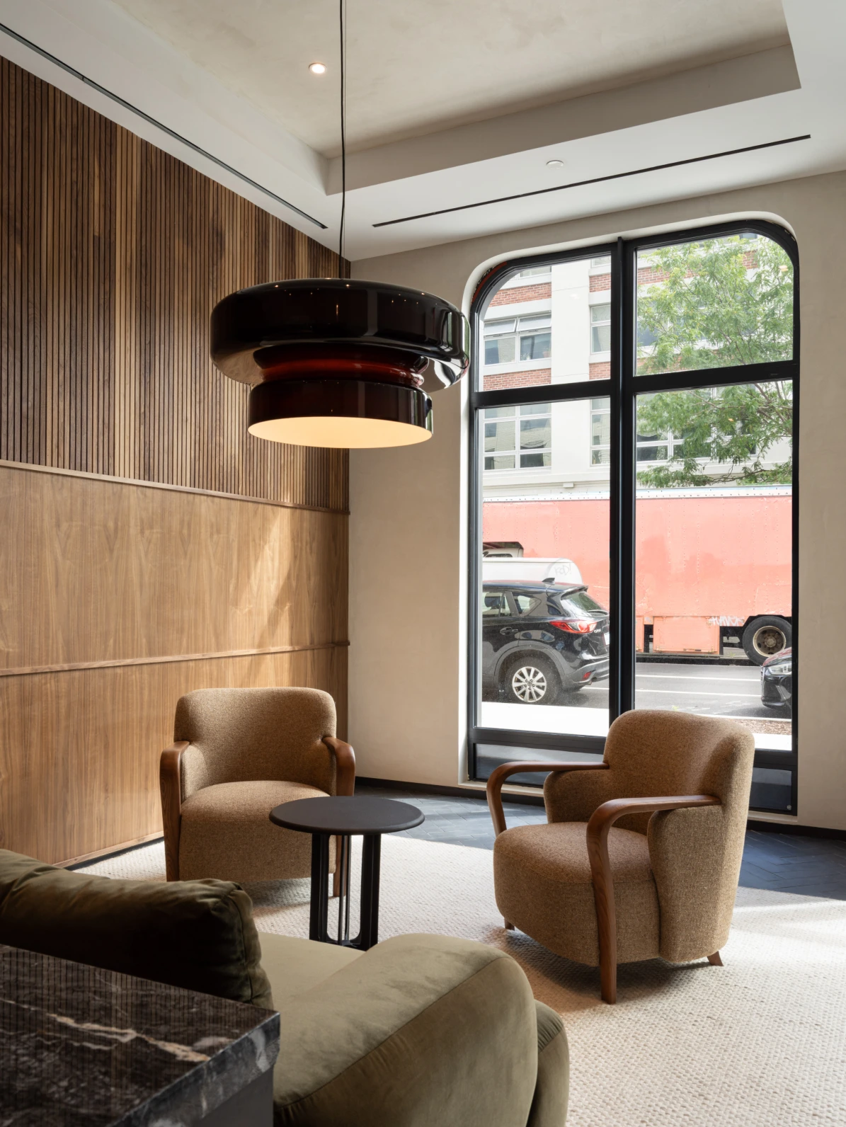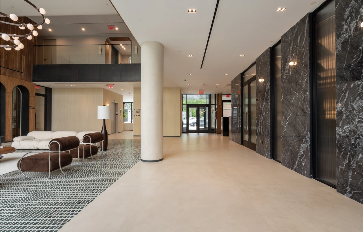 Amenity spaces throughout the building reflect a dynamic blend of utility and style, from the cozy lounge with its custom furnishings to the bold coworking zone framed by natural light and wooden accents.