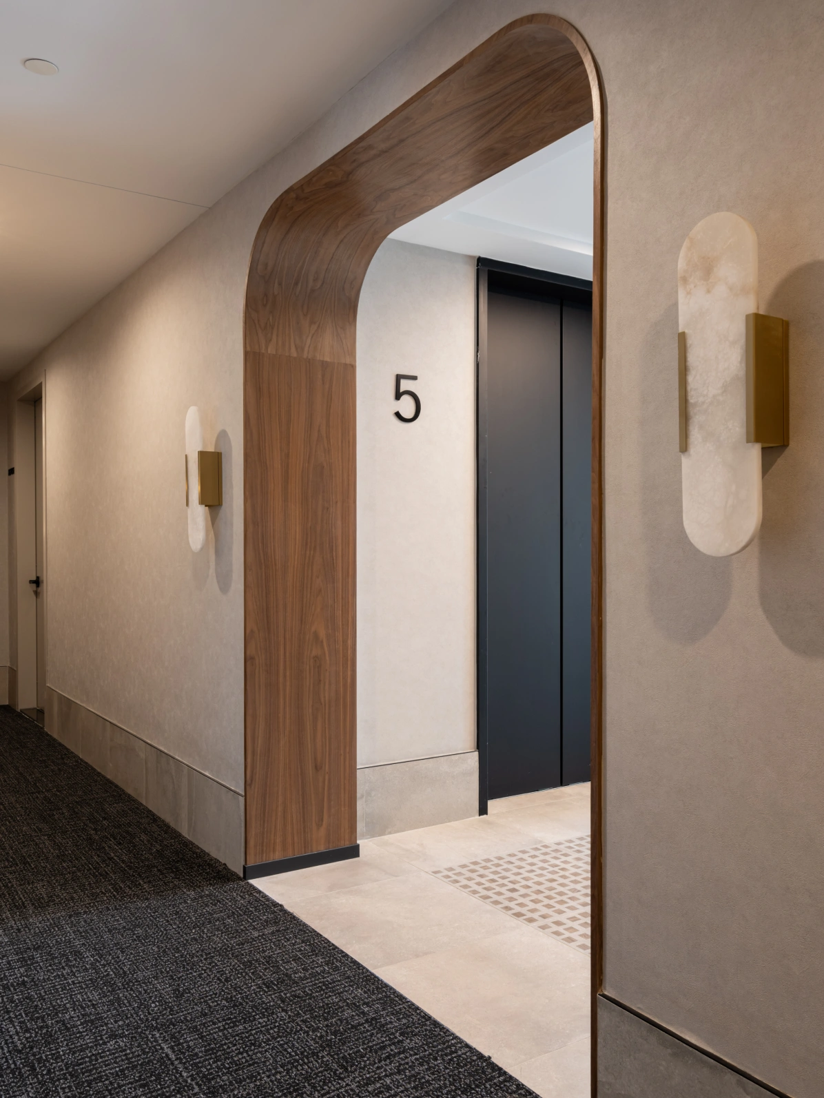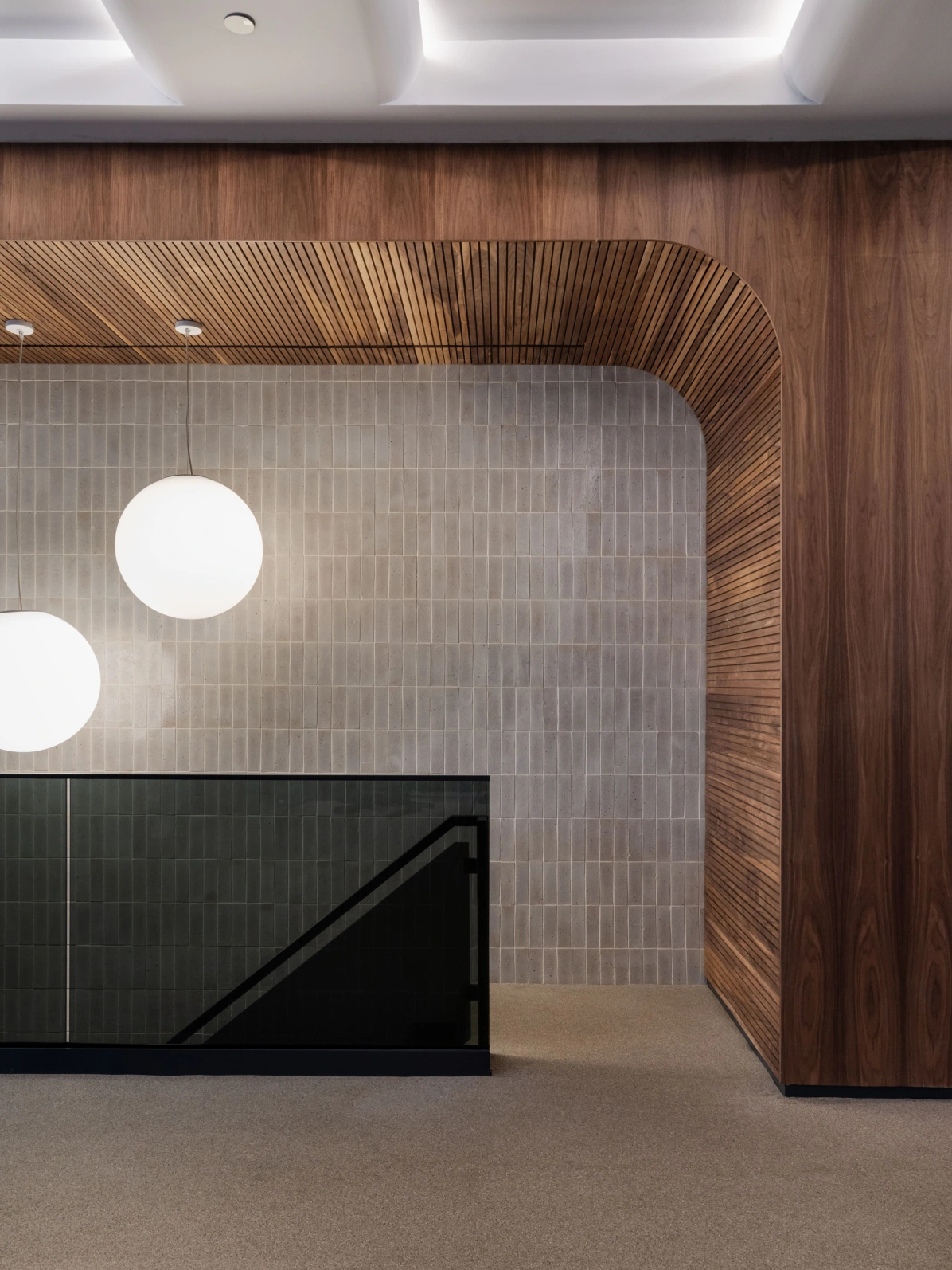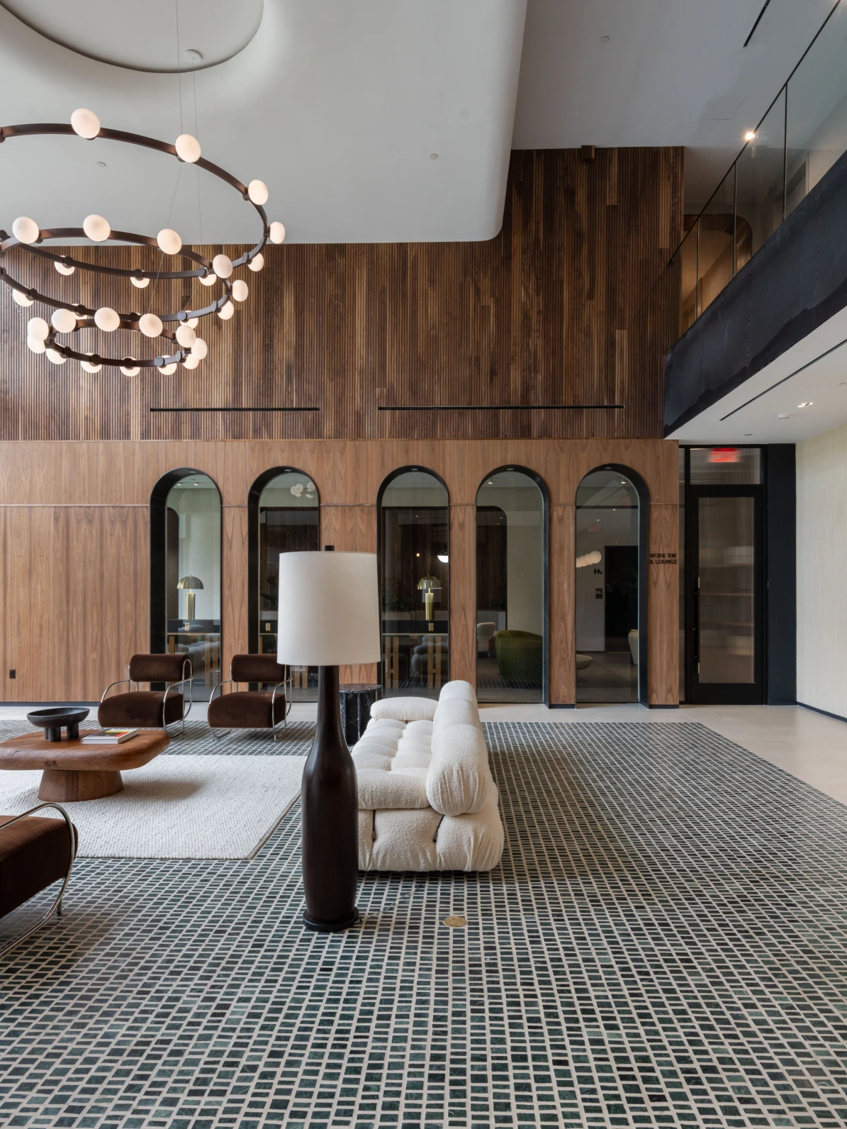 The lobby welcomes visitors with a soaring double-height space, anchored by sculptural lighting and a rich interplay of warm wood and textured stone.