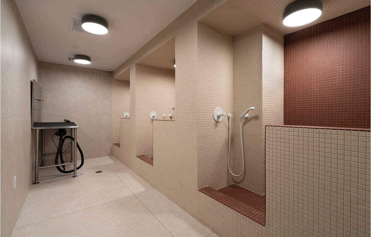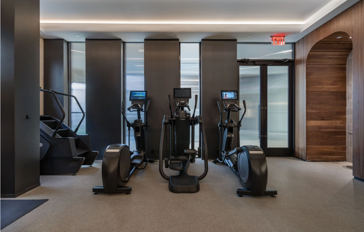The design language flows seamlessly into every amenity and communal space, from the hallways and gym to the pet wash station, by maintaining the signature wood accents, graceful arches, and beautiful tile work.