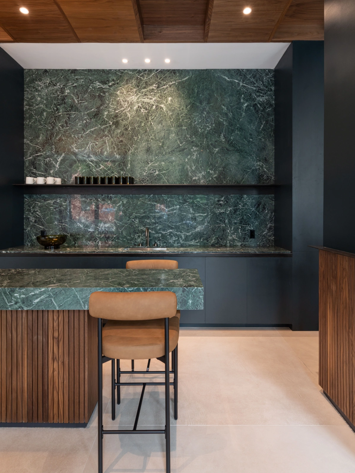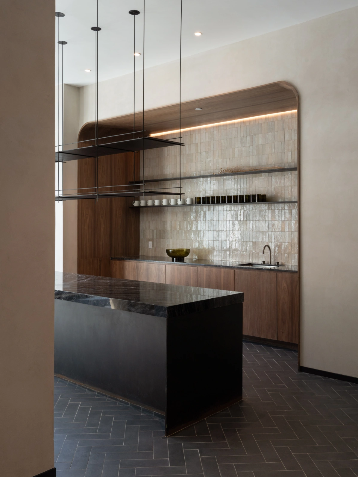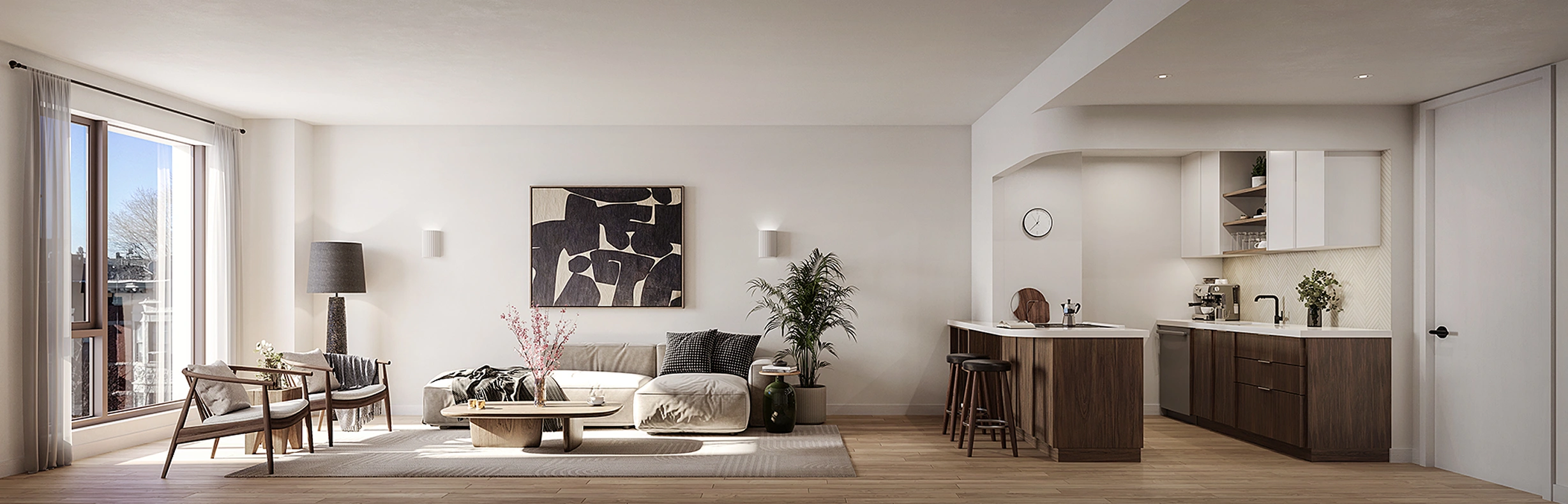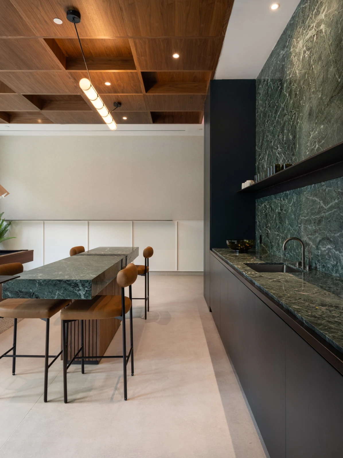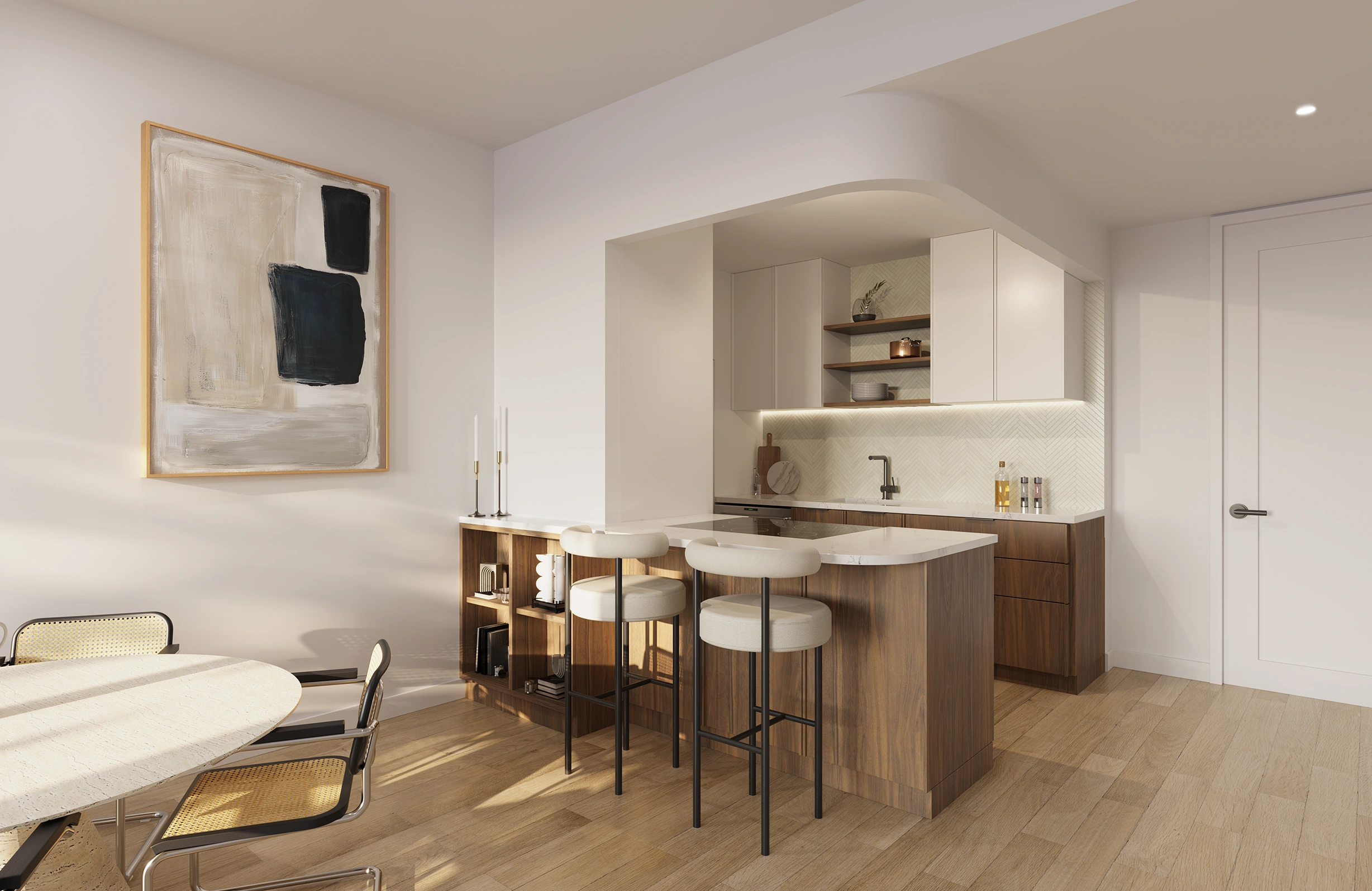 Inside, apartments feature open kitchens with clean lines and stone accents, seamlessly integrated with inviting dining spaces, balancing function and refined design.