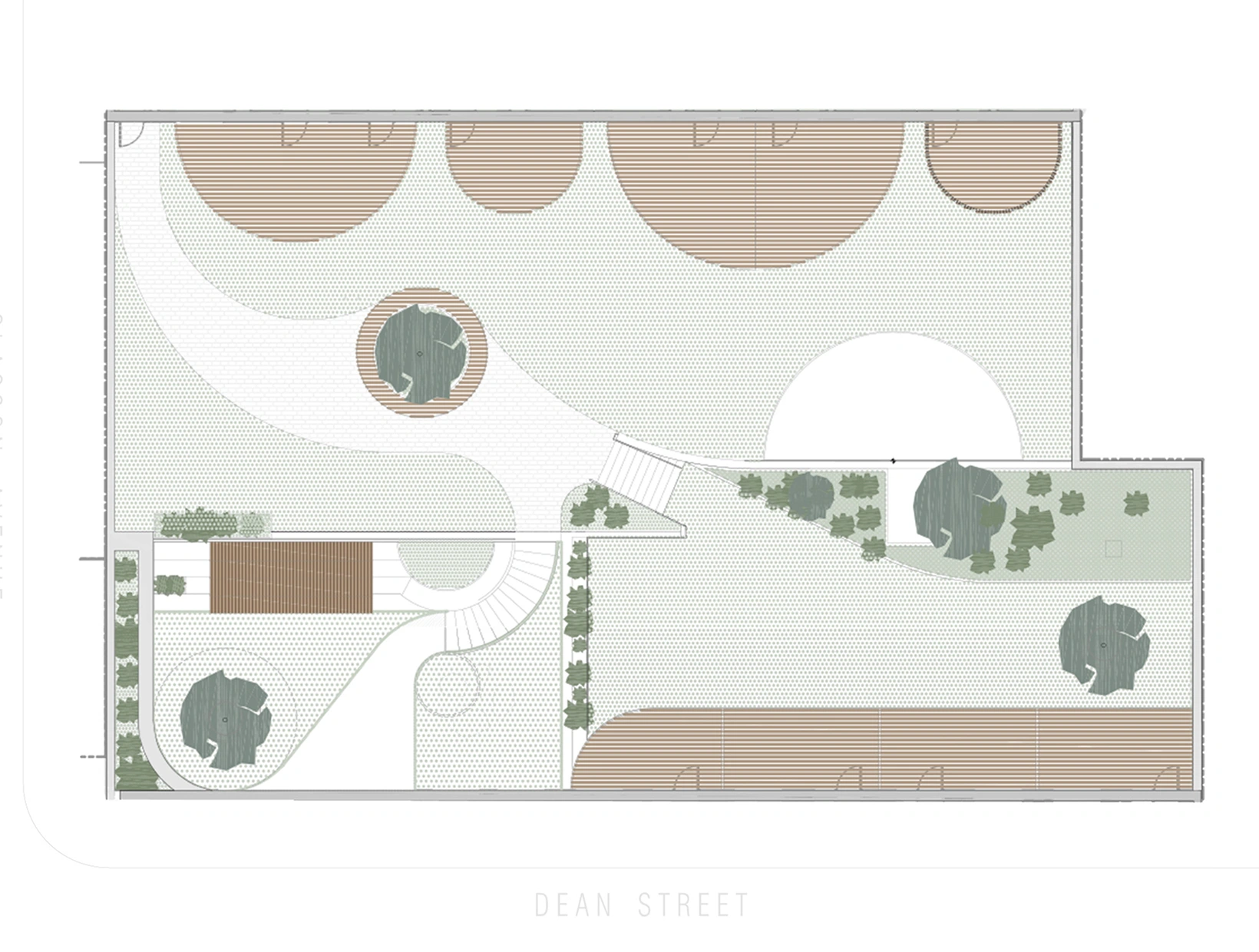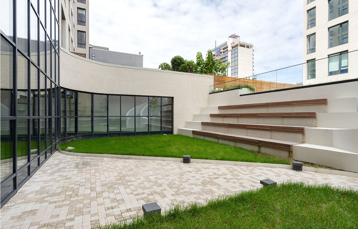 The second-floor terrace, visible from within, invites nature into the architecture through large glass walls and curated greenery, offering a tranquil visual and social connection between interior and exterior.