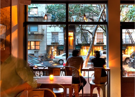 The interior of Bar Prima creates a unique atmosphere with soft, ambient lighting paired with weathered wood accents and rustic elements evoke a cozy yet contemporary feel. The juxtaposition of clean lines with industrial touches, like corten steel and subtle contrasts between the light entry and darker back areas, forms a balanced and layered experience.