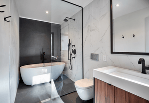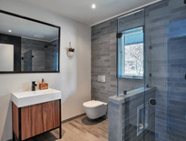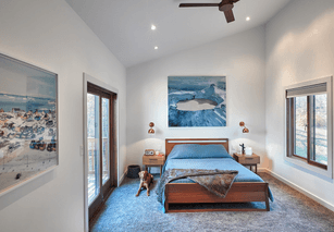 The bedrooms are serene retreats with minimalist detailing and natural finishes, inviting soft daylight. The bathrooms echo this elegance, with custom millwork, sleek fixtures, and a spa-like primary bath featuring a soaking tub and expansive shower.