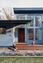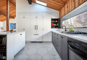 The exterior transformation balances preservation and modern upgrades. Darkened wood cladding enhances its sculptural presence, while new openings frame views of the landscape. The design respects the home’s original form while elevating its character.