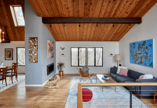 The living spaces blend warmth and modernity, with natural light highlighting wood beams, polished concrete floors, and bespoke built-ins. A mix of mid-century and contemporary furniture, soft textiles, and a wood-burning stove create a cozy yet refined atmosphere.