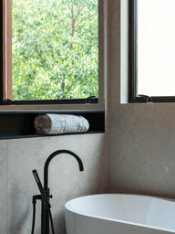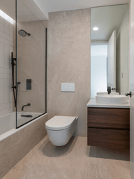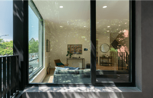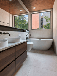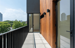 The balcony design extends the home’s connection with the outdoors, using the same wood material as the ceiling in the bathrooms. This thoughtful consistency in materials unifies the design, ensuring a cohesive aesthetic from the exterior to the interior.