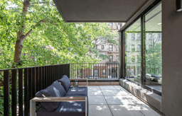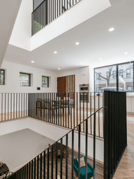 The façade’s subtle brick tones complement the historic school next door, creating a harmonious connection with its surroundings. At the entrance, warm wooden detailing contrasts with the brick, offering a welcoming touch. Vertical windows and finely crafted metalwork add a modern flair, while the material choices ensure a balance between tradition and contemporary design.