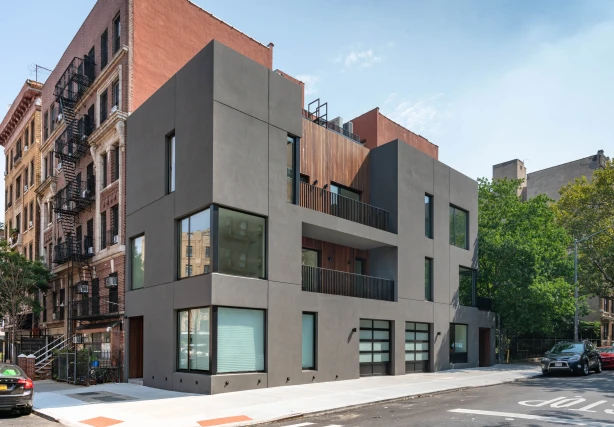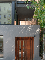 The concept for these two connected townhomes was contextually driven by responding to the street corner condition and the small green space which the end of the lot abuts. The large window openings are positioned to give the vertically cut townhomes unique views to green spaces at unexpected moments while being the generator for the unique facade.