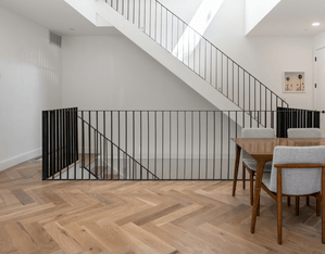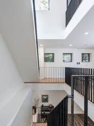 The interiors are defined by clean lines, rich materials, and ample natural light. The staircase, with its sleek design and interplay of sunlight, becomes a central feature, enhancing the flow of the space while maintaining a sense of openness.